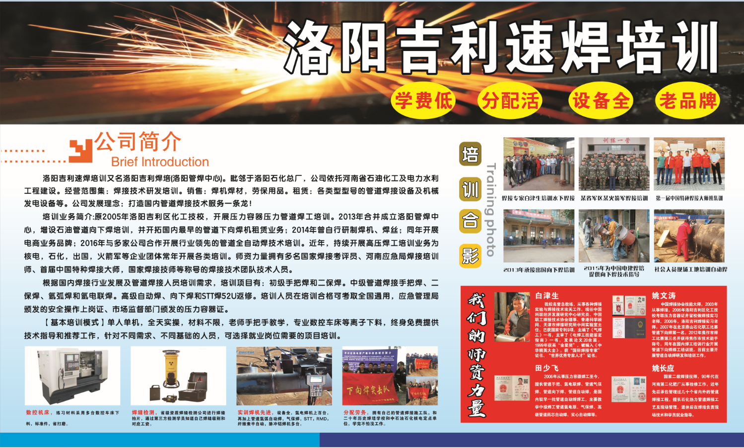 电焊,高等焊工进修,来洛阳吉利速焊,费用低:管道氩电联学习3.8K一月,技术高:学好毕业分配做焊培老师,没有钱:(先学习毕业后交费),挣钱学慢:免费安置月薪九千起,出国2W起。