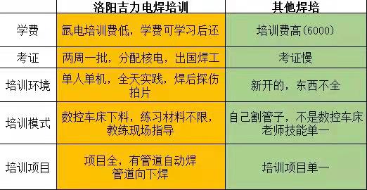 学电焊,电焊工培训学校,电焊工证怎么选?来河南吉力电焊工培训学校费用低:管道氩电联学习3800一月(别的学校都6/7千)技术高:学了高级管道下向,管道自动焊毕业分配别的学校做焊培老师(他们都没见过)没有钱:(先学习毕业后交学费)挣钱慢:免费国外安置月薪2万起。考焊工证2周一次,出证快不耽误事!